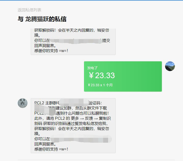 #12 我赞助达到23.33及以上了,如何获得赞助者隐藏主题 2020-07-24- 2021-02-25 uncategorized爱发电截图23.33及以上的付款情况↓↓ 发送给lm 请 直接在爱发电内私聊 lm!!! 如果你通过QQ的方式联系,有较大的几率会忘记给你发解锁码 私聊内容:你的识别码 获取识别码和使用解锁码激活方式如下图↓↓ 龙猫将会在1-2个工作日(一般半天)内回复您,请勿对爱发电或龙猫qq进行消息轰炸之类的事情!(小心被夹 赞助PCL2启动器.